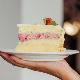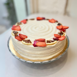 Bizcocho de limón embebido con almíbar de limón, relleno con curd de limón, nata con fresas, cubierto con cheesecream de ganache de chocolate blanco, fresas y limoncitos.