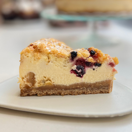 Tarta de una base de queso y manzana, con crumble y frutos rojos.