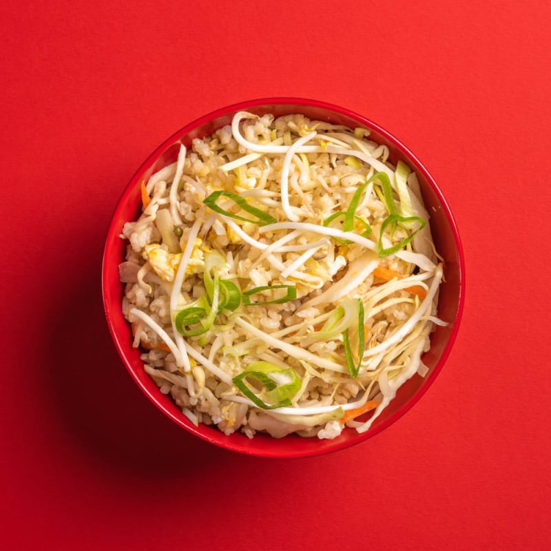 Arroz jazmín salteados con huevo revueltos, proteína a elegir (Pollo o Tofu o Heura), cebolla roja, verduras frescas, nuestra salsa teriyaki, topping de cebolla frita y lima.