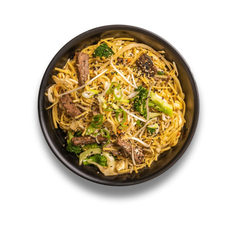 Noodles de huevo salteados con huevo, ternera, brócoli, verduras frescas nuestra salsa teriyaki y topping de sésamo mix.