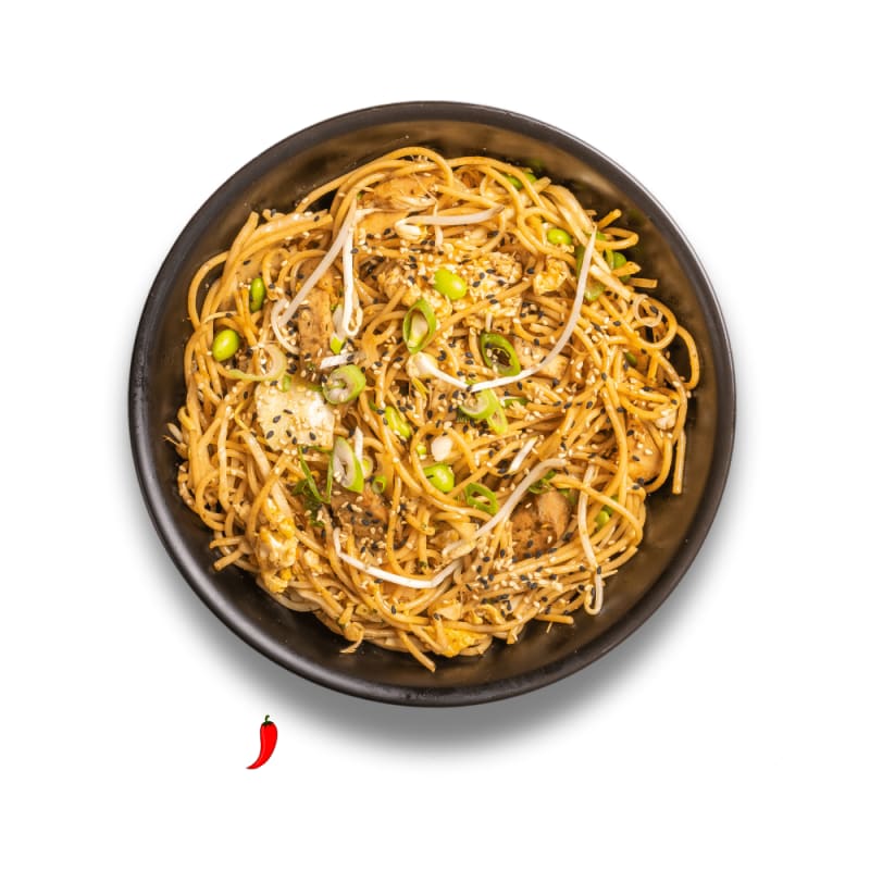 Noodles de integrales salteados con huevo, pollo, edamame, verduras frescas con nuestra salsa pimienta negra y topping de sésamo.