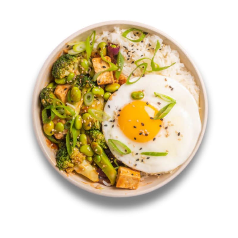 Arroz al vapor, tofu, brócoli, edamame, huevo, cebolla roja, cebolleta, sésamo mix y salsa a elegir.