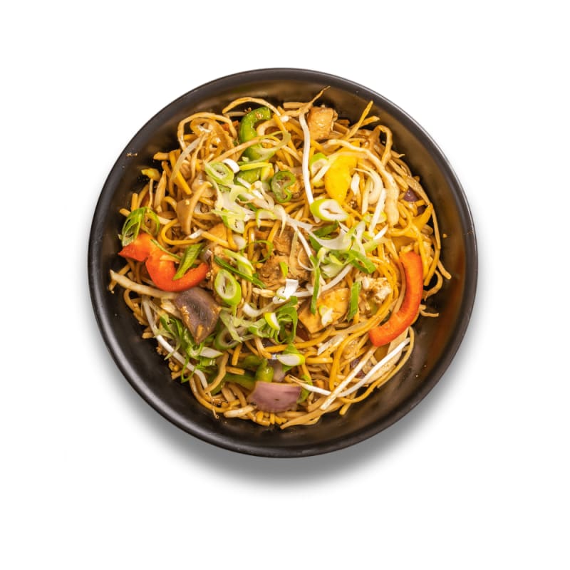 Noodles de integrales salteados con huevo revueltos, proteína a elegir (Pollo o Tofu o Heura), mix de pimientos, verduras frescas, nuestra salsa teriyaki, topping de cebolla frita y lima.