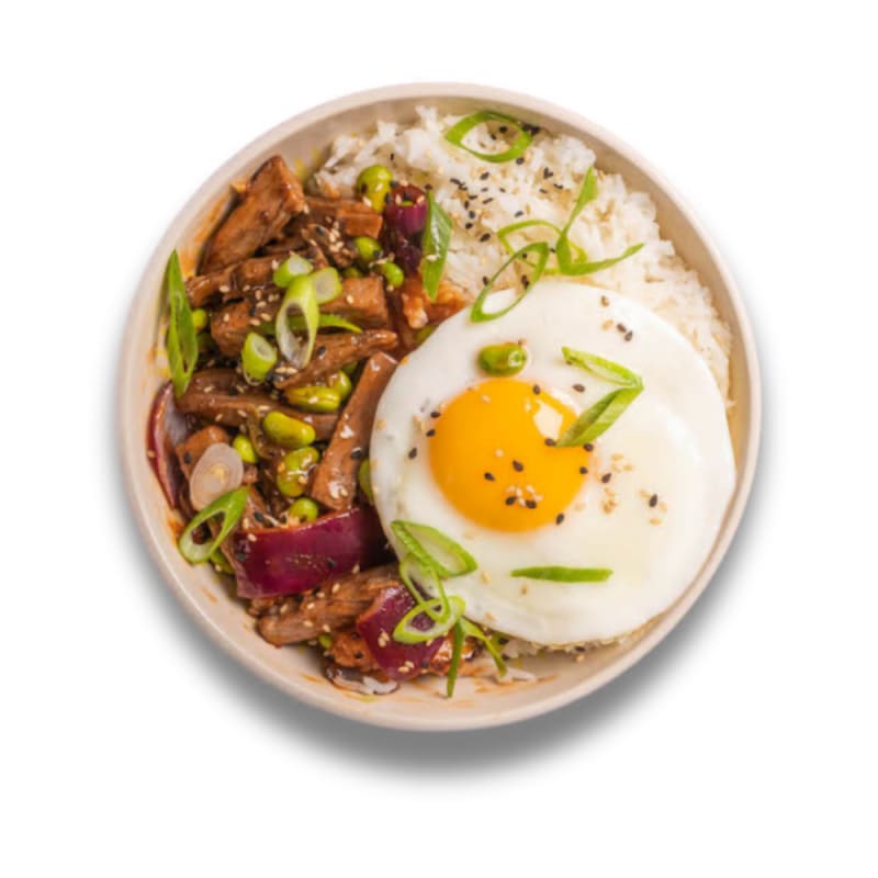Arroz al vapor, ternera, edamame, huevo, cebolla roja, cebolleta, sésamo mix y salsa a elegir.