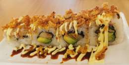 arroz de sushi relleno langostino frito ,aguacate ,encima aguacate,queso,cesamo y salsa teriyaki