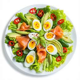 Lechuga, mango, huevo cocido, aguacate y salmón ahumado