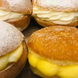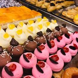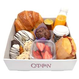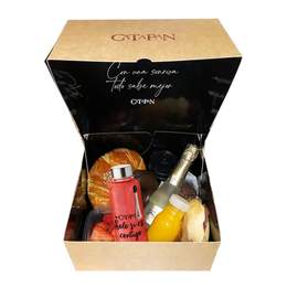 Con café con leche, croissant, donut, tortita de aceite de jamón, cava Freixenet, zumo de naranja natural, fresas, muffin de chocolate, bombones variados y dedicatoria