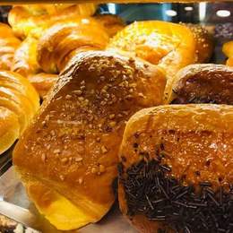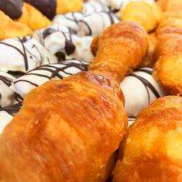 Con croissant, miel de la alcarría, zumo natural, donut, sorianitos, cookies, fruta, torta de jamón serrano, muffín y café con leche