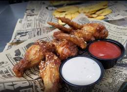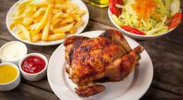 Pollo entero con piel marinado con una mezcla secreta de especias y hierbas. Tradicionalmente se acompaña con patatas fritas, ensalada fresca, vinagreta, crema de rocoto y ají de pollería