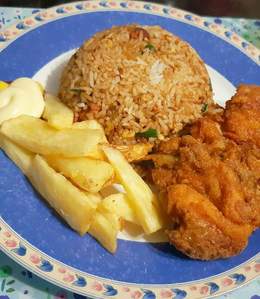 Porción de pollo broaster, arroz chaufa que es arroz salteado al estilo oriental y una buena cantidad de papas fritas