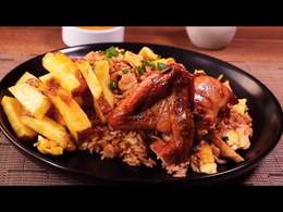 Arroz chaufa, patatas fritas y una porción de pollo a la brasa