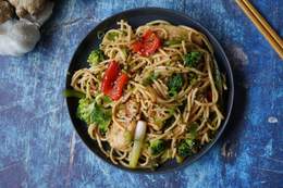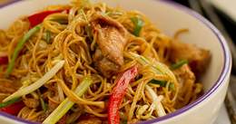 Fideos chinos salteados a fuego alto con cebolla china, pimiento, brócoli, pollo y una salsa aromatizada con sillao (salsa de soja), aceite de sésamo, jengibre y salsa de ostión