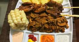 Corazón de res (anticucho) y callos (rachi), ambos macerados en vinagre y especias como ají panca, ajo y orégano, y cocinados a la parrilla. Acompañados de papas sancochadas y choclo