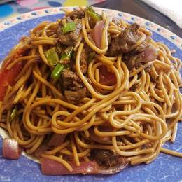 Carne de res en tiras al wok con salsas, tallarines, cebolla, tomate y cebolla china