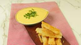 Bastoncitos de yuca frita, acompañados de salsa huancaína