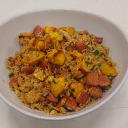 Arroz frito al estilo chifa oriental con cecina, chorizo, plátano frito, tortilla, cebollino, jengibre y salsas orientales