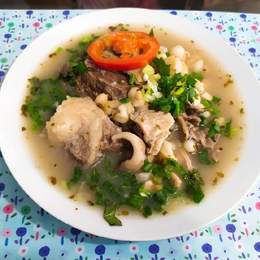 Sopa andina nutritiva hecha con mote (maíz cocido y reventado), acompañada de diversas carnes (res, callos), hierbas y especias
