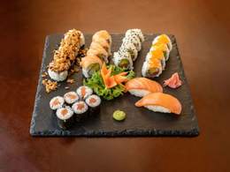 4 Salmón aguacate, 4 california salmón, 4 Philadelphia, 4 california pollo kimono, 2 nigiri salmón, 6 maki salmón, contiene gluten, pescado, cacahuates, lácteos y sésamo