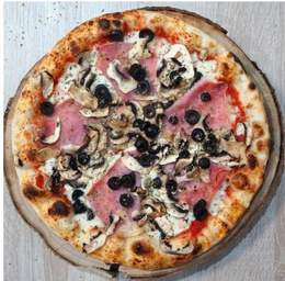 Tomate, champiñones, pimiento, cebolla, maíz, olivas negras y mozzarella