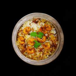 Langostinos cocinados en una salsa de tomate y cebolla. Acompañado de arroz basmati.