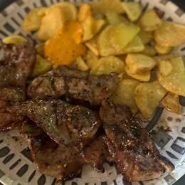 Pechuga de pollo empanada con cereales y frutos secos. Acompañado de patatas fritas y salsa teriyaki.