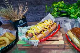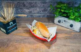 Bocadillo en pan tierno de salchicha, patatas paja, pepinillo picado, lechuga, queso, mostaza y bacon a tiras.