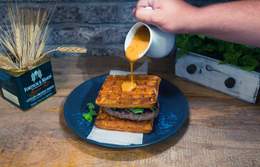 Entra por petición popular. Burger donde el pan son dos gofres, hamburguesa de buey de 250 gramos, pepinillo y cebolla morada terminada en la mesa con nuestra salsa casera de cheddar chipotle.