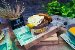 Hamburguesa de buey y ternera, cheddar, bacon, jamón, huevo, lechuga, cebolla confitada, mayonesa de bacon y mermelada de tomate en nuestro pan brioche.