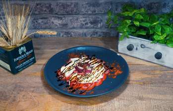 Mozarella troceada acompañada de tomate fresco y pesto verde
