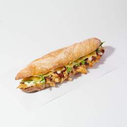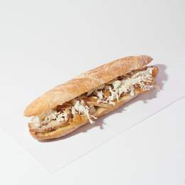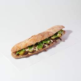Pollastre rostit, sucós i ple de sabor, amb maionesa de poma casolana, tomàquet, formatge scamorza fos i ruca fresca. Tot dins d’una barreta de pa de vidre cruixent i irresistiblement addictiu.