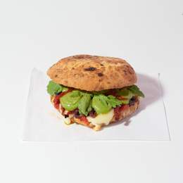 Pa de vidre estil pita, farcit amb la nostra crema de pesto i anacards, tomàquet san marzano, olives de kalamata i mozzarella.