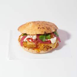 Un viatge en dues direccions, pollastre esfilagarsat amb curri, pebre roig i llima, servit amb formatge, col cruixent, kimchi, salsa “sweet chili”, pico de gallo, ceba encurtida i crème fraîche. Tot plegat dins d’un pa de pita planxat.