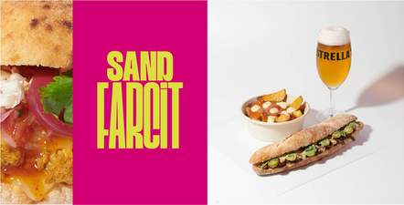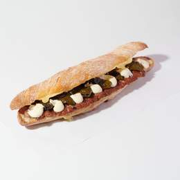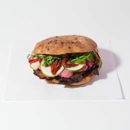 Brisket a l'estil usa: 6 hores de cocció lenta, amb un toc fumat i posteriorment esmollat. Maionesa cremosa elaborada amb la seva pròpia cocció, formatge fos, ruca i cogombret, tot dins d’un pa de vidre cruixent.
