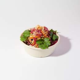 Barreja cruixent de col xinesa, col llombarda, pastanaga, cogombre i cacauets, amanida amb salsa thai casolana i coriandre fresc
