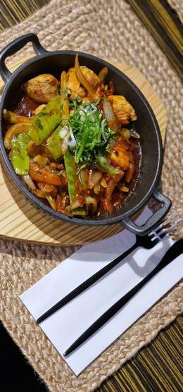 Pollo o cerdo, cebolla, tomate y tirabeques en un salteado perfecto con salsa de soja picante