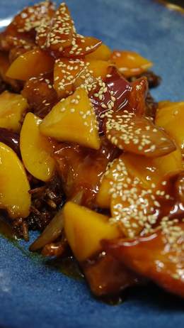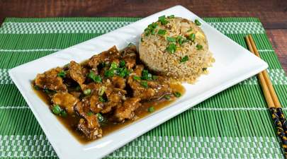 Cerdo agridulce con piña, melocotón y verduras, acompañado de un arroz frito con soja y lima