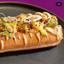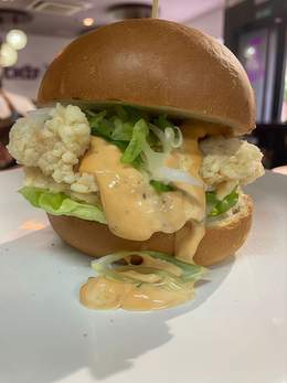 Pan brioche, pollo rebozado en chuño, lechuga, cebolla china y nuestra salsa secreta cítrica picante, acompañada de chips con mayonesa de kimchi