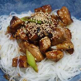 Solomillo de cerdo salteado al wok con ajo en laminas, pasta de jengibre y ajo, cebolla china y una salsa a base de soja clara y salsa de ostras, acompañado de fideos de arroz