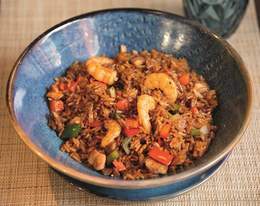 Arroz salteado con langostinos, pollo, pimientos y salsa de soja del abuelo (mezcla de 3 sojas)