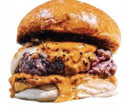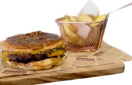 Pan brioche con un toque de mantequilla, doble carne smash, queso cheddar, tiras de bacon extra crujiente, coronada con cebolla caramelizada y un toque de pepinillo. Ternera 100% (200 g.). Con patatas caseras y salsas de la casa