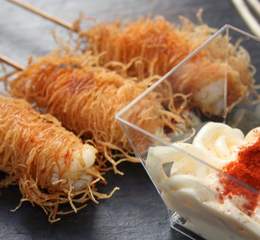 Tiernos langostinos, envueltos de la crujiente pasta griega kataifi. Nuestra salsa especial dará el último toque