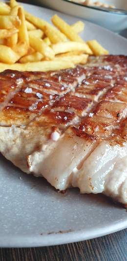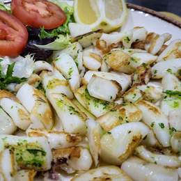 Delicia de sepia a la plancha con un toque de ajo y perejil,acompañado de ensalada y limón