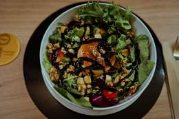 Mezcla de brotes, frutos secos, cebolla crujiente y rulo de cabra