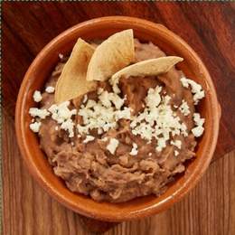 Ración de frijoles bayos refritos, machacados en caldo de cerdo acompañada de queso blanco rayado y totopos