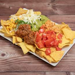 Ración de totopos coronados con un delicioso guiso de carne de ternera o pollo, frijoles negros, arroz, lechuga, tomate, guindillas, maíz, totopos, queso y opcionalmente guacamole