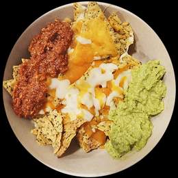 Crema de aguacate natural, mozzarella 100%, carne bolognesa, nachos de chia, cheddar y salsa valentina (picante)