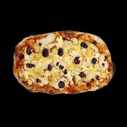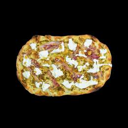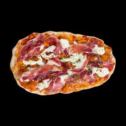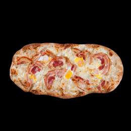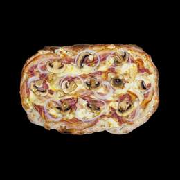 Salsa carbonara, mozzarella 100%, panceta arrotolata, champiñón natural y ceba de Figueres