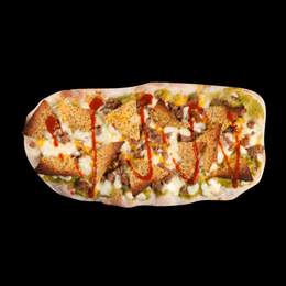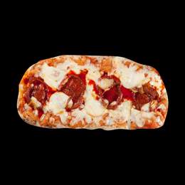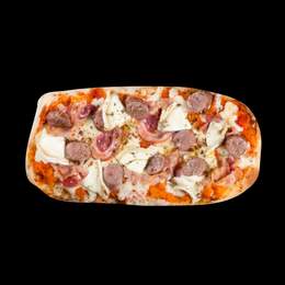 Salsa de tomate, mozzarella, cervela, bacon crujiente y salsa de mostaza