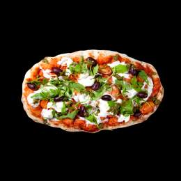 Salsa de tomate, mozzarella vegana 100%, calabacin, champiñón natural, pomodori secchi y aceite de albahaca