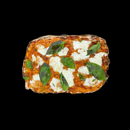 Salsa de tomate, Burrata, AOVE y hojas de albahaca.